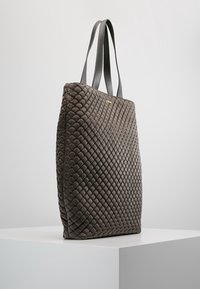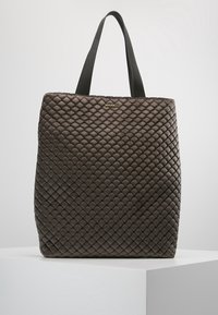 Sac fourre-tout tissé marron avec un motif losange diagonal, poignées en cuir et un petit accent en métal de la marque près du haut. Forme plate et rectangulaire.