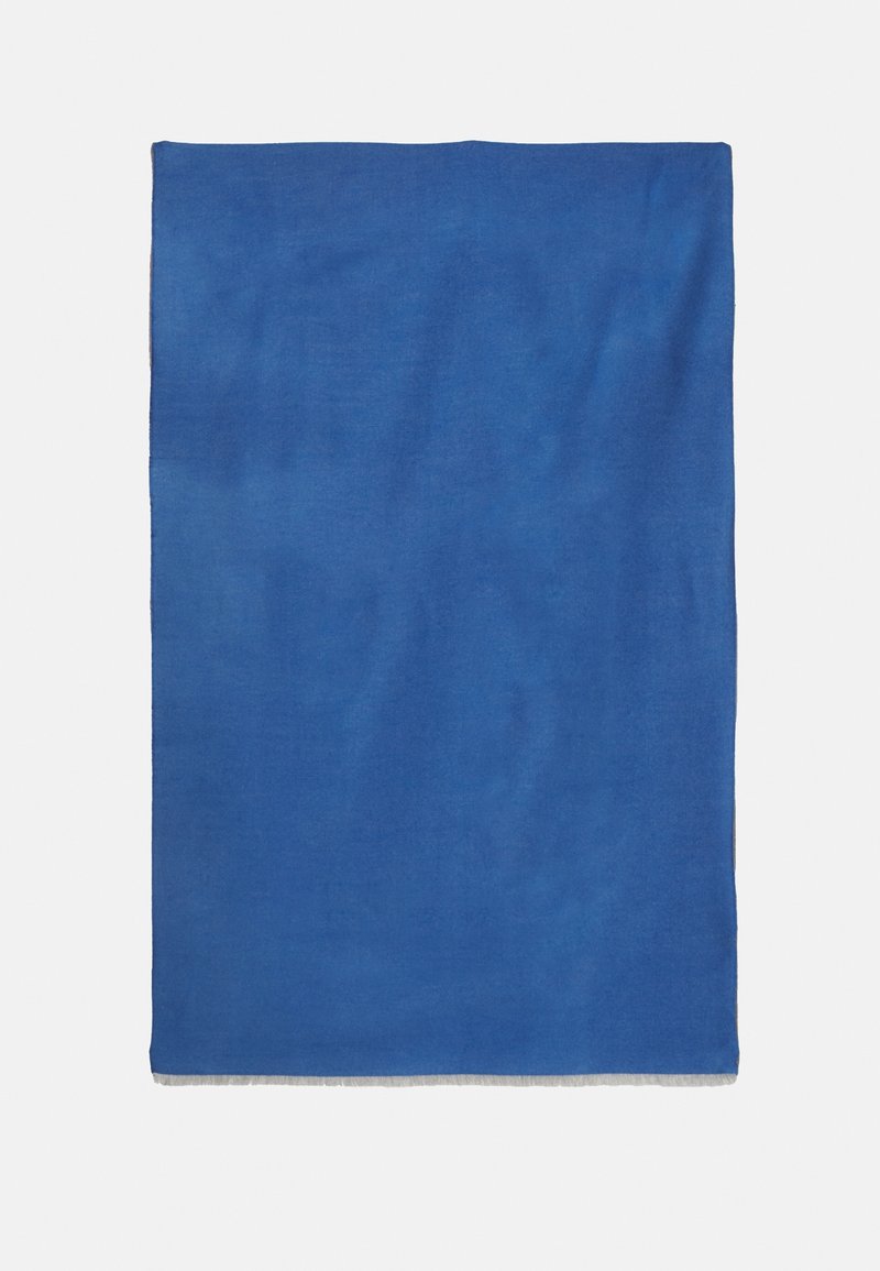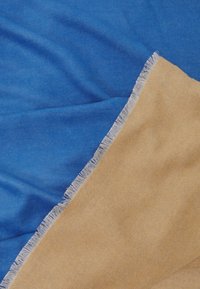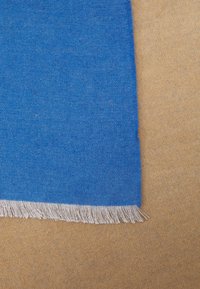 Couverture textile bleue, forme rectangulaire, texture lisse, bords frangés, répartition uniforme de la couleur, tissu doux.