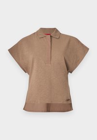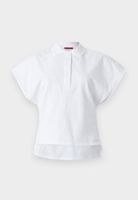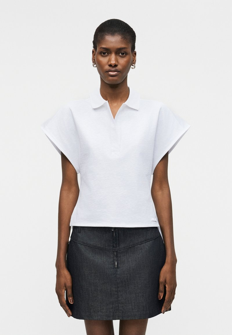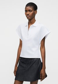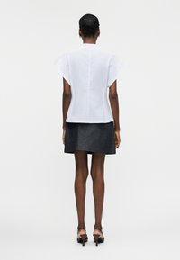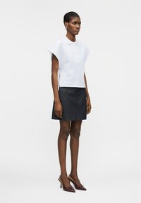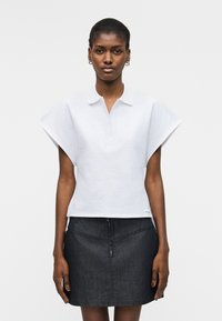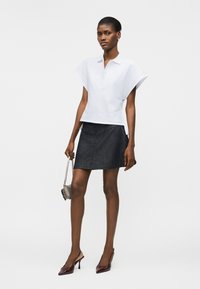 Femme portant un haut blanc structuré à manches courtes avec col et une mini-jupe en jean foncé taille haute, debout devant un arrière-plan uni.