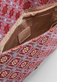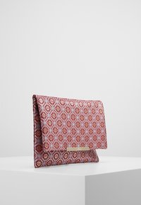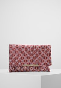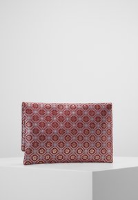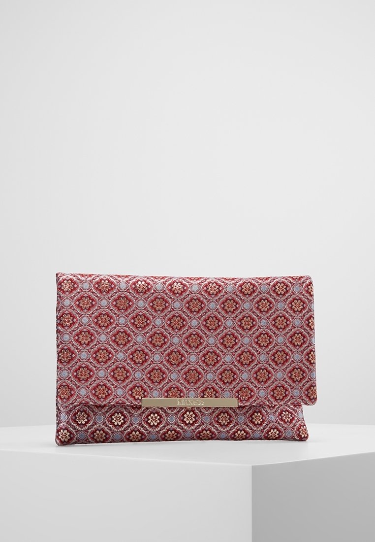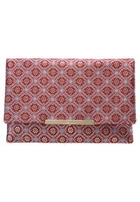 Pochette rouge rectangulaire avec un motif floral et géométrique répétitif, ornée d'une petite plaque de marque en métal doré sur le rabat avant.
