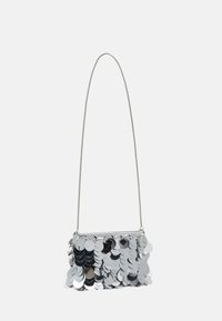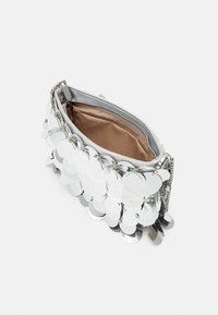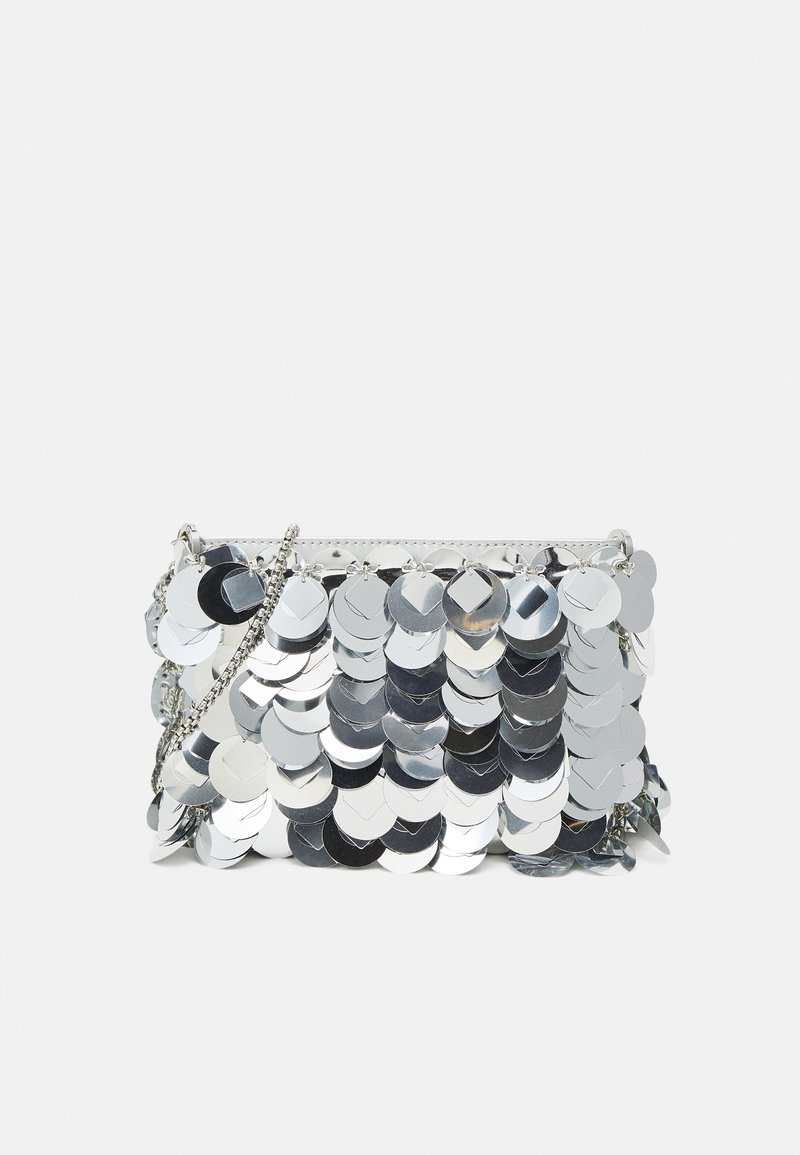 Sac de soirée en sequins argentés avec une bandoulière enchaînée, présentant des sequins réfléchissants en forme circulaire, une forme rectangulaire et une surface texturée.