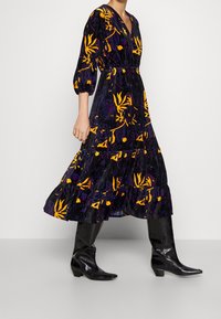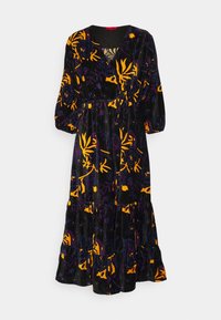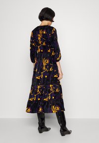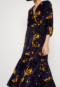 Robe noire avec une silhouette fluide, ornée de motifs floraux colorés en violet et orange. Manches longues, taille froncée, jupe à volants.