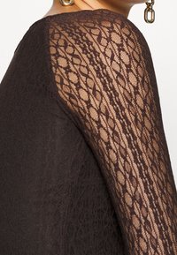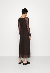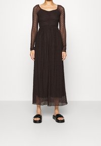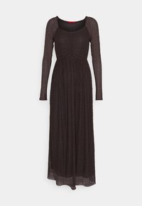 Robe à manches longues marron foncé avec un tissu texturé présentant un motif subtil. La robe a un corsage ajusté et une jupe fluide qui descend jusqu'au sol.
