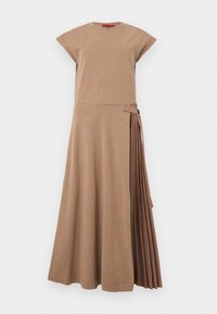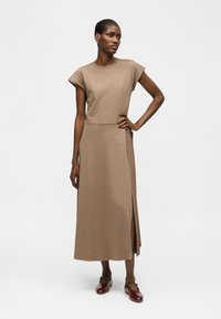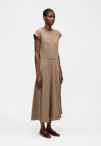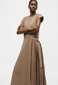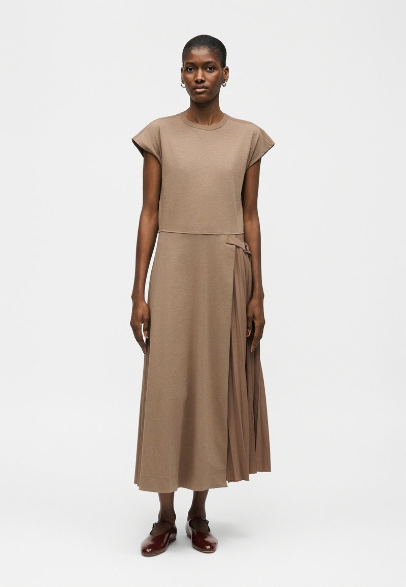 Femme debout portant une robe midi taupe sans manches avec un panneau plissé latéral et des chaussures plates marron sur fond blanc uni.