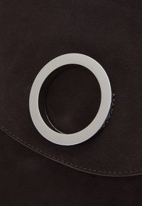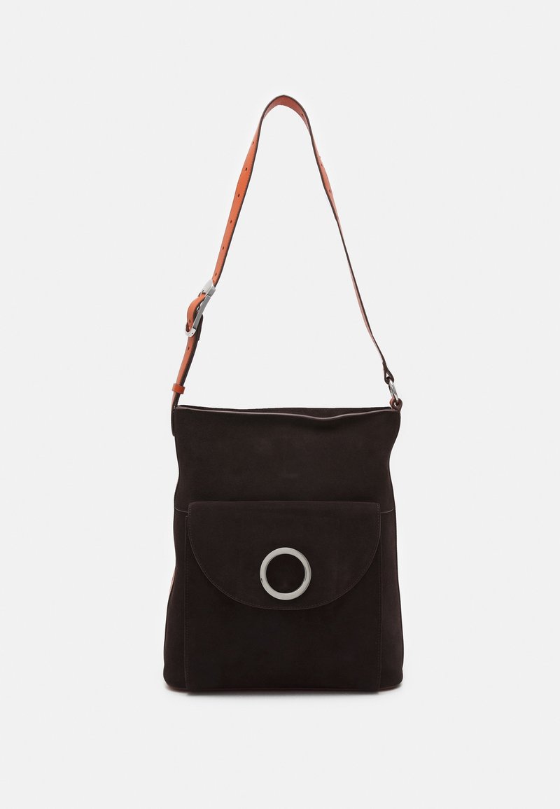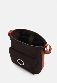 Sac à bandoulière en daim noir avec une sangle réglable en cuir orange, doté d'une poche avant avec un accent en métal argenté circulaire.