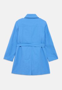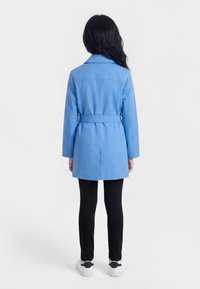 Fille aux longs cheveux bruns portant un manteau bleu ceinturé, un pantalon noir et des baskets blanches, debout devant un fond blanc uni.