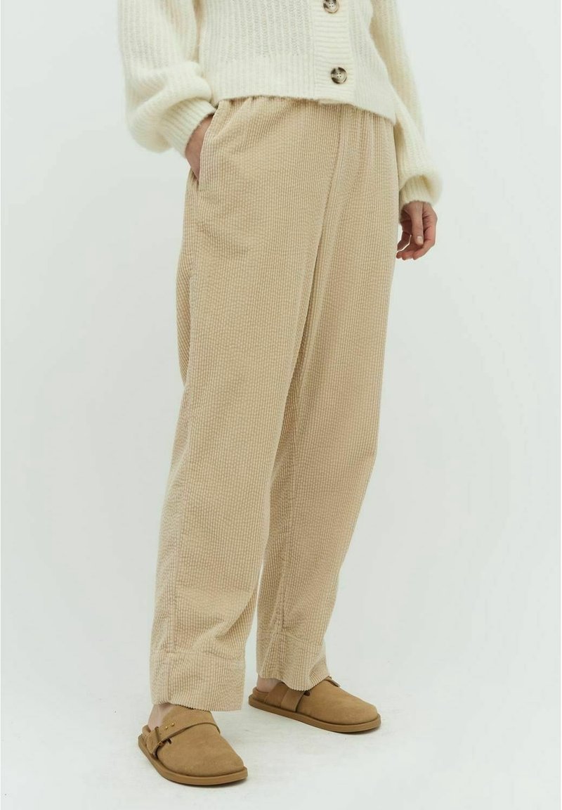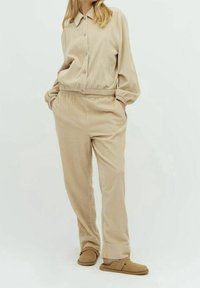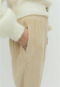 Personne portant un pantalon beige texturé, des chaussures marron clair sans lacets, et un pull crème en maille avec des boutons, debout avec une main dans la poche.