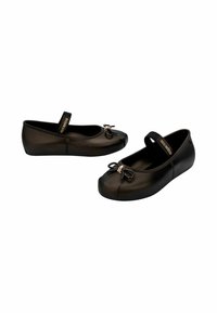 Chaussure plate Mary Jane noire avec bout carré, bride élastique et petit nœud décoratif avec anneau doré sur le devant.
