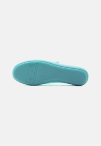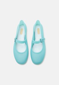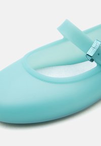 Chaussure Mary Jane bleu clair avec bride à boucle ajustable et bout arrondi, vue de côté sur un fond uni.