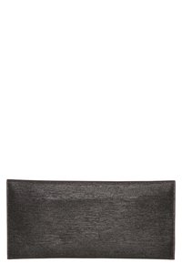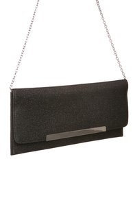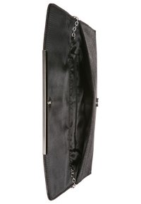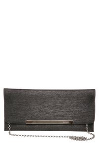 Pochette noire à surface texturée, avec un accent en barre argentée et une bandoulière chaîne amovible pour plus de polyvalence.