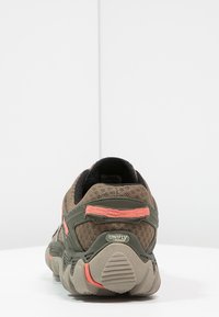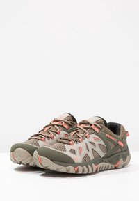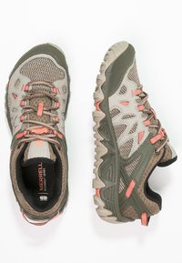 Chaussure de randonnée Merrell marron clair et vert olive avec une semelle robuste et des accents corail, conçue pour les sentiers extérieurs.