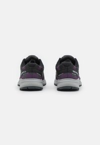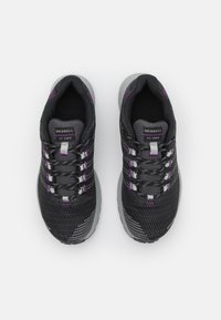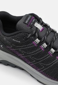 Chaussure de sport Merrell noire et violette avec semelle grise, empeigne en mesh, et design à lacets, vue de profil sur fond blanc.