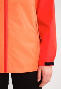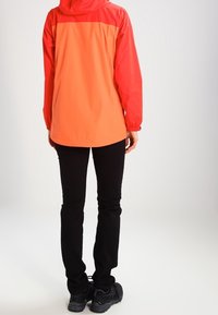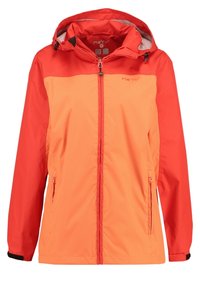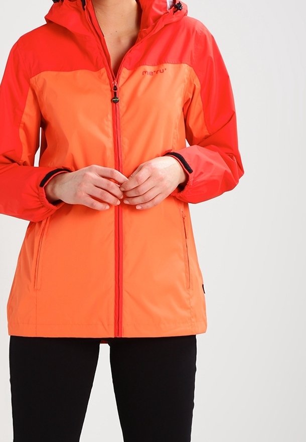 Femme portant une veste de pluie zippée bicolore rouge et orange avec capuche, fermant la fermeture éclair avant, pantalon noir visible.