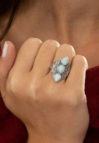 Main avec des ongles peints en blanc portant une bague en argent décorée avec trois pierres ovales bleu clair sur le doigt du milieu.