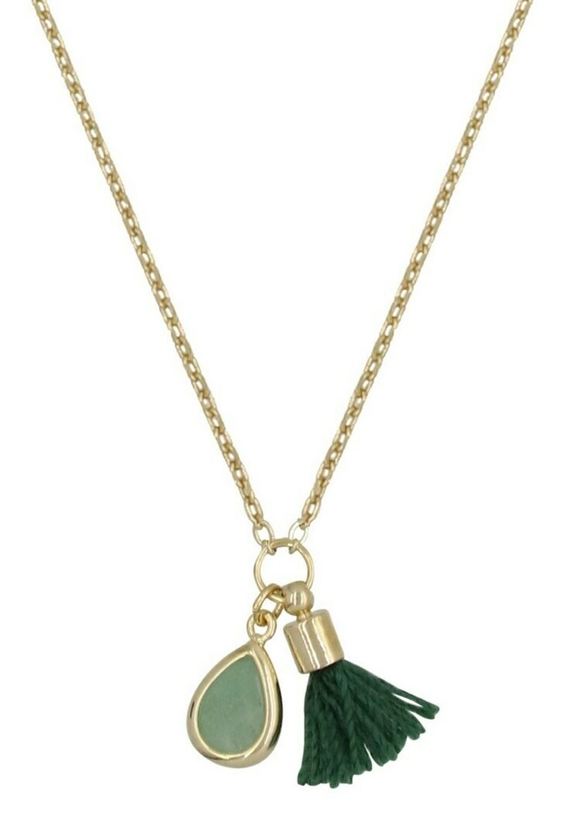 Collier en chaîne dorée avec un pendentif vert en forme de goutte et un pompon en tissu vert foncé suspendu à une petite bague.