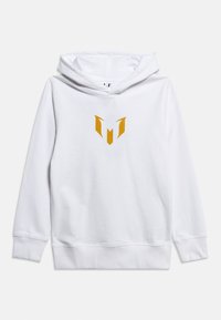 Enfant aux cheveux bruns mi-longs portant un sweat à capuche noir avec un emblème jaune, un pantalon gris foncé et des baskets blanches, debout sur un fond blanc.