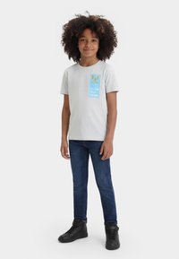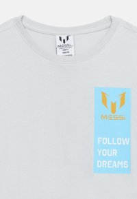 Enfant aux cheveux bouclés portant un t-shirt blanc avec le texte « Messi Follow Your Dreams », un jean bleu et des baskets montantes noires.