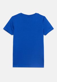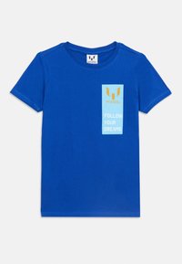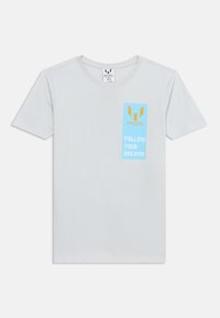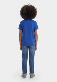 Enfant aux cheveux bouclés portant un t-shirt bleu "Suis tes rêves", un jean bleu retroussé et des chaussures grises sans lacets, debout devant un fond uni.