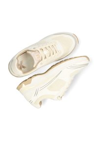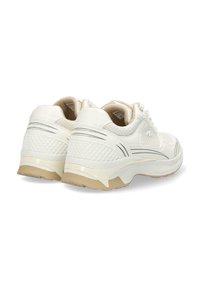 Baskets blanches de sport avec texture en maille, accentuées par des rayures grises, associées à un pantalon rose vif. La chaussure présente des lacets ronds et une semelle rembourrée.