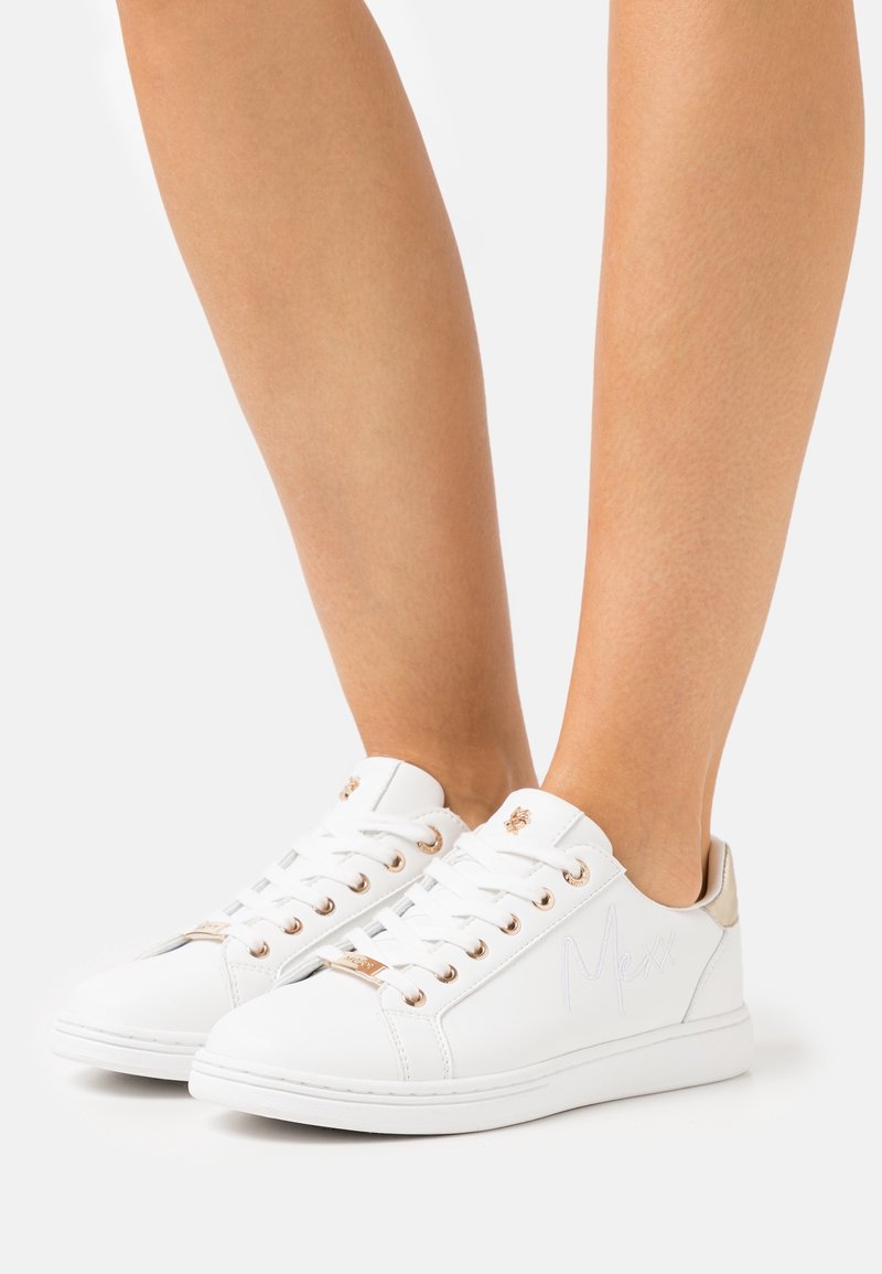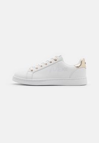 Baskets basses blanches en cuir lisse. Présentent des œillets, des lacets et un logo subtil imprimé sur le côté en or rose. Semelle texturée.