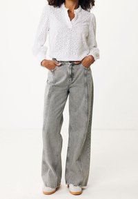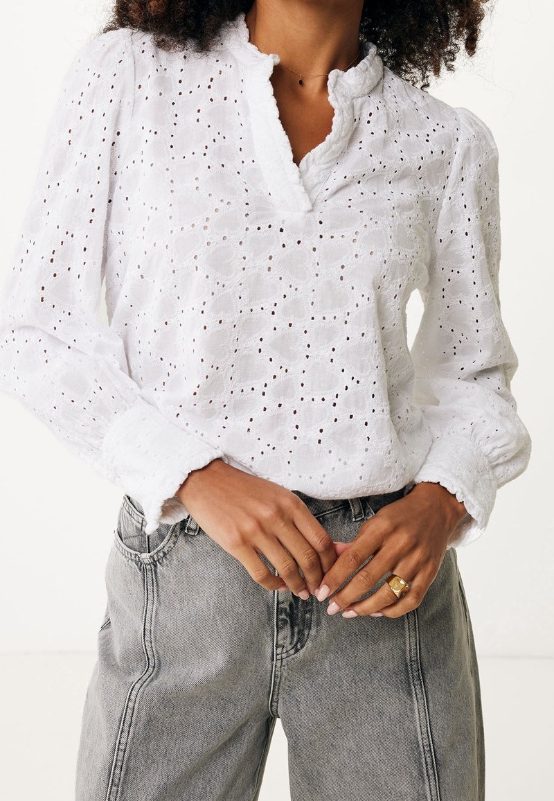 Femme portant un chemisier blanc en dentelle œillet avec un col et des poignets à volants, associé à un jean gris taille haute, les mains jointes montrant une bague en or.