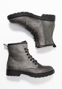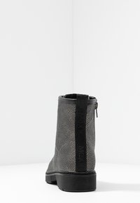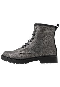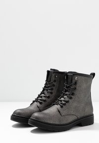 Personne portant des bottines montantes à lacets texturées métalliques noires avec des fermetures éclair latérales et un jean court bleu clair sur un fond uni.