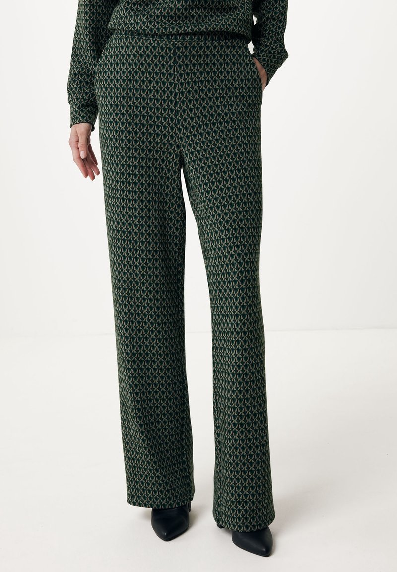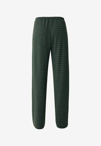 Pantalon large à motifs verts avec un design géométrique, fabriqué en tissu doux ; il présente une coupe décontractée et des poches latérales.