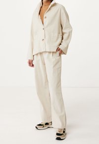 Personne portant un pantalon large en velours côtelé crème, des baskets beige et noir, et un haut à manches longues couleur beige, debout sur un sol et un mur blancs.