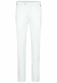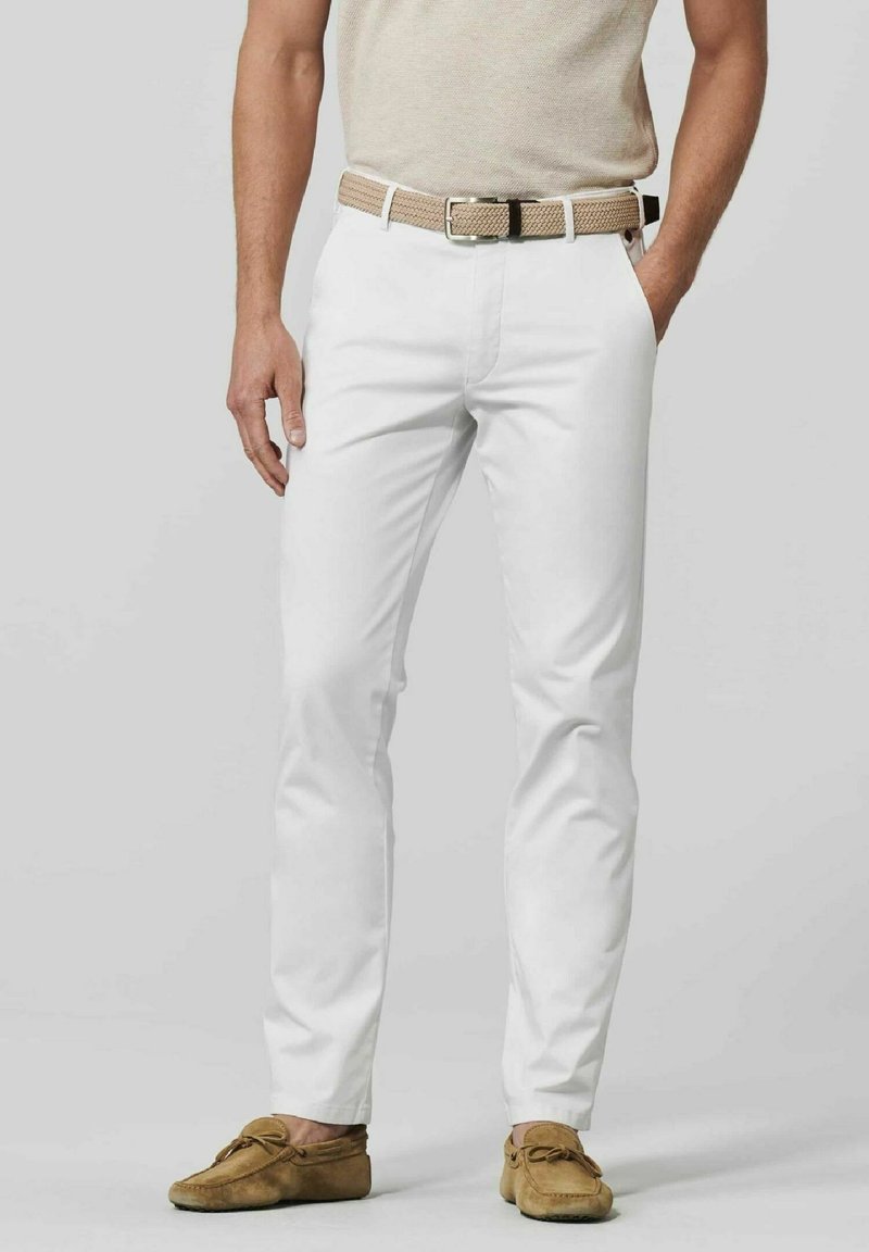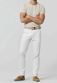 Pantalon blanc en coton à coupe droite, doté de poches avant. Associé à une ceinture beige tissée et des chaussures marron à enfiler.