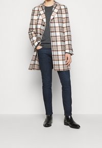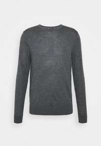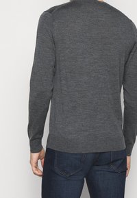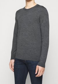 Pull gris foncé à manches longues avec un col rond, fabriqué en matière douce et texturée. Comprend des poignets côtelés et un ourlet droit.
