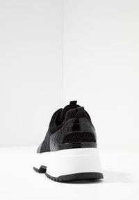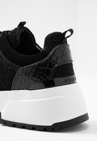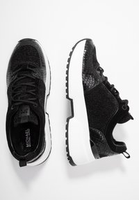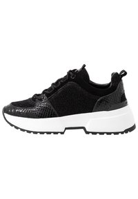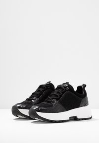 Baskets noires avec un design texturé comprenant des accents pailletés et imprimés serpent, une semelle blanche épaisse et des lacets noirs.