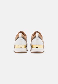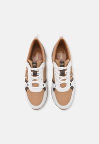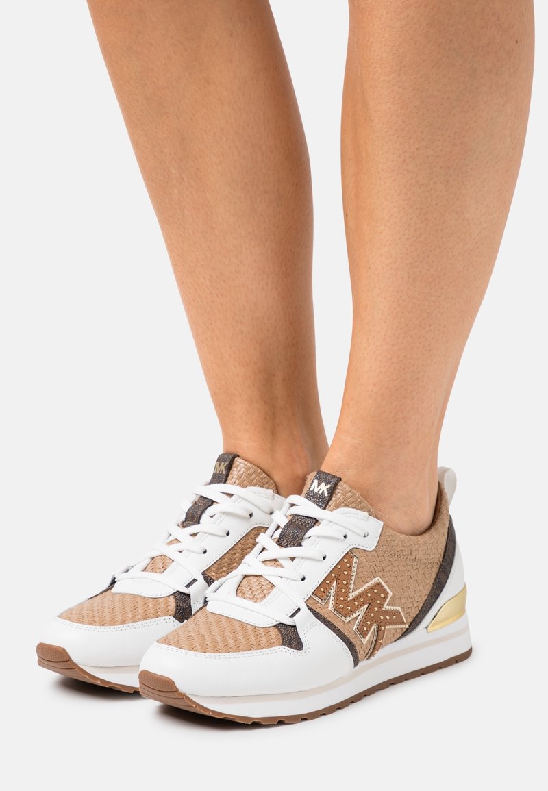 Baskets présentant une tige tissée de couleur beige avec des accents en cuir blanc, un détail doré au talon, et des lacets noirs et blancs.