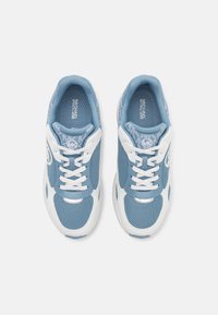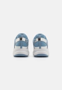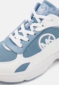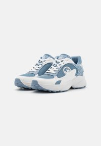 Baskets bleu et blanches en mesh et matériaux synthétiques, avec un accent bleu texturé, un logo rond et un design de semelle épaisse.