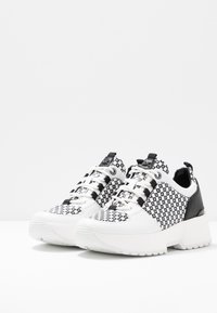 Baskets blanches avec des accents noirs et une tige à motif présentant de petites lettres. Semelle épaisse avec des détails texturés et un design à lacets.