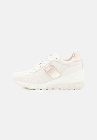 Basket à talon compensé blanc avec accent métallique doré rose et logo « MK » sur le côté, dotée d'une fermeture à lacets et d'une semelle texturée.