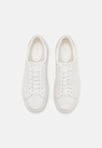 Baskets basses blanches avec fermeture à lacets, semelle texturée embossée du motif "MK" et détails en strass sur la languette du talon.