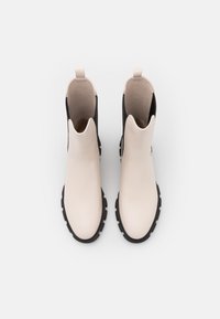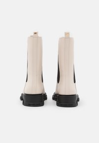 Bottes blanches en cuir à cheville avec des panneaux latéraux élastiques noirs, bouts arrondis et semelles épaisses en caoutchouc noir. Texture lisse et design élégant.