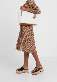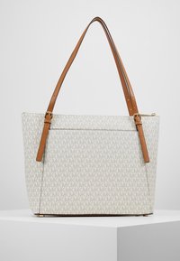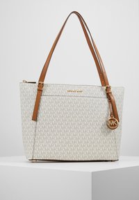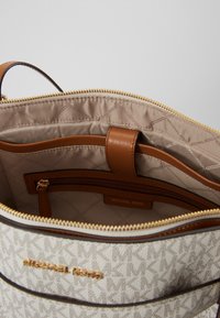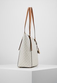 Sac fourre-tout en toile beige avec un motif répétitif du logo MK, bretelles en cuir marron et ferrures dorées. Comprend un porte-clés décoratif.