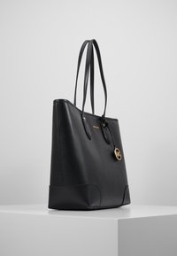 Sac fourre-tout en cuir noir avec deux anses, quincaillerie dorée et un pendentif avec logo. Présente une forme structurée et une texture lisse.