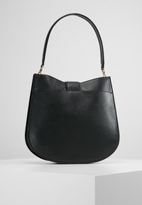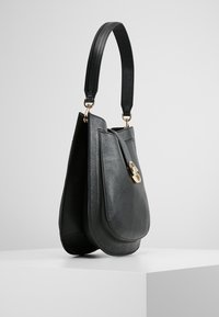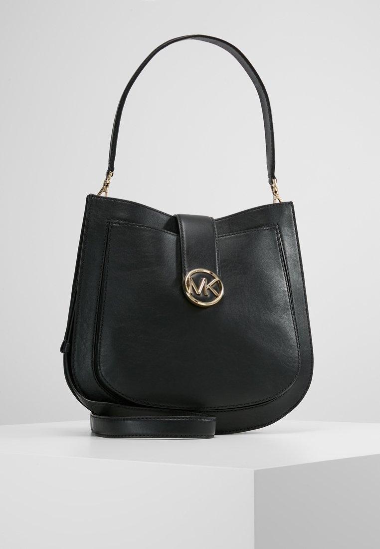Sac à main en cuir noir avec une bandoulière unique et un fermoir circulaire doré "MK" sur le devant, présenté sur un socle blanc.