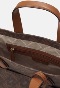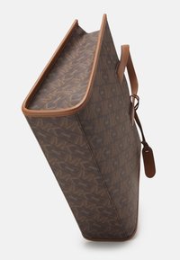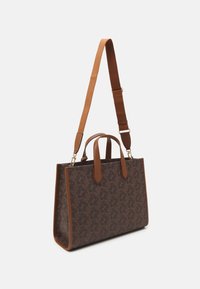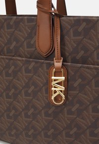 Sac cabas en cuir marron avec motif monogramme, double poignée, bandoulière réglable et breloque logo MK dorée sur le devant.