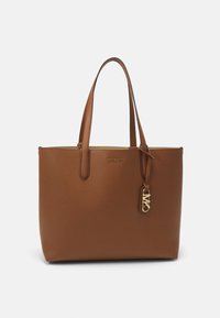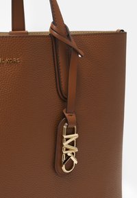 Sac fourre-tout en cuir marron avec poignées doubles et pendentif logo MK doré sur fond uni.
