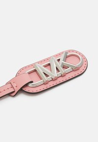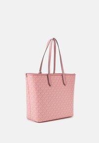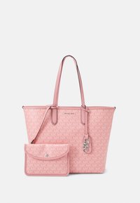 Sac cabas rose avec un motif texturé de logos "MK", doté de poignées en cuir lisse et d'une garniture en métal argenté.