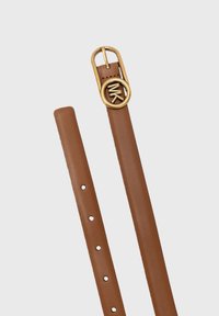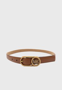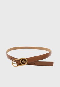 Ceinture en cuir marron avec une boucle ronde en laiton gravée du logo "MK". Texture lisse avec un design classique et une couture minimale.