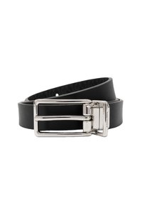 Ceinture en cuir noir texturé avec boucle rectangulaire argentée brillante, enroulée sur un fond blanc.