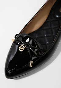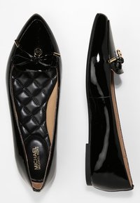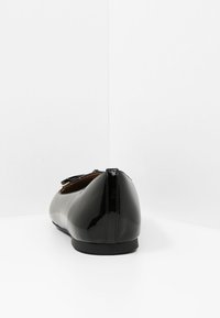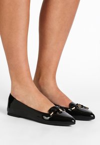 Jambes portant des ballerines noires en cuir verni à bout pointu, avec un détail de nœud et de frange en ton doré sur fond blanc.