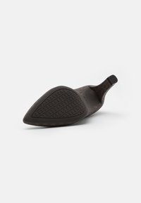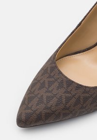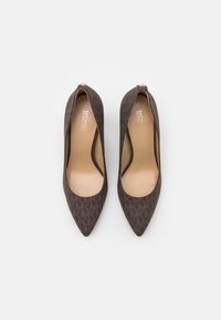 Escarpin à talons hauts marron à motif, avec un bout pointu et une surface texturée. Il possède un talon et une doublure intérieure lisse.