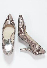 Escarpins à motif peau de serpent en nuances de brun et beige. Bout pointu, côtés ouverts, et talon d'environ 7,5 cm. Texture lisse.