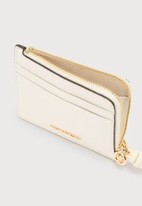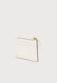 Porte-cartes en cuir blanc avec fermeture éclair dorée, bracelet pour poignet et logo Michael Kors sur la poche avant, sur fond uni.