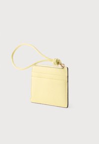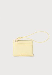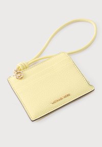 Porte-cartes bracelet en cuir jaune pâle avec trois emplacements pour cartes, poche zippée et charm logo Michael Kors en or avec inscription.